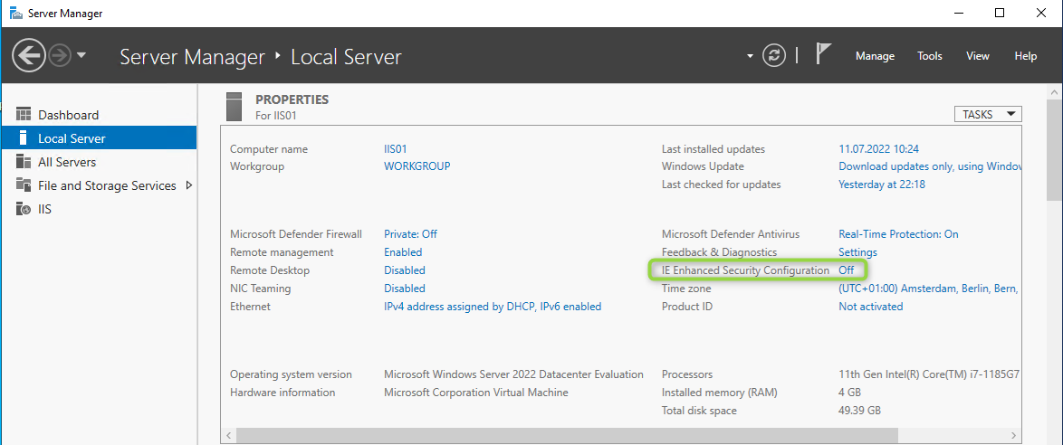 - Handelt es sich um ein Server-Betriebssystem, sollte im Server Manager die Enhanced Security Configuration (ESC) deaktiviert werden